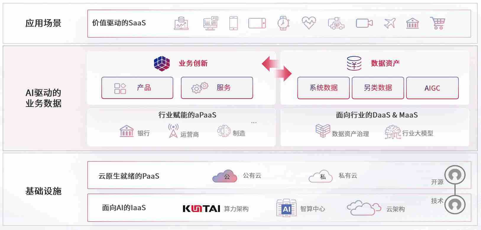 数字时代,,,,围绕企业数字化转型的关键要素,,,南宫娱乐数码开创性的提出数云融合战略和技术体系框架,,着力在云原生、、数字原生、、、AI原生和信创产业上架构产品和服务能力,,为处在不同数字化转型阶段的快消零售、、、汽车、、、、金融、、、、医疗、、、政企、、、、教育、、、、运营商等行业客户提供泛在的敏捷IT能力和融合的数据驱动能力,,,构建跨界融合创新的数字业务场景和新业务模式,,,,助力企业级客户建立面向未来的核心能力和竞争优势,,全面推动社会的数字化、、、智能化转型升级。。。